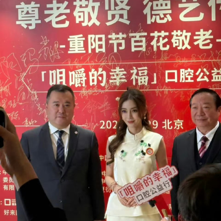 晚会的高潮出现在公益环节。Angelababy手持公益牌站在红色背景板前,两侧是身着深色西装的合作方代表。背景板上“尊老敬贤”的标语与她的身份形成巧妙呼应——作为香港政协青年联会公益慈善委员会副主任,她早已将公益融入职业生涯。从2014年鲁甸地震捐款到2020年支援武汉,从发起“早产天使基金”到倡导环保,她的善行跨越十年,而此次聚焦老年人口腔健康的公益行动,更是直击老龄化社会痛点。有观众留言:“她让重阳节不再只是形式,而是实实在在的关怀。”